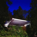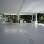 The house is built on a sloping site, and in order to minimize the excavation work the rear half of the house is dug into the ground, the excavated earth being used as fill for the front half, creating a level floor. The floor surface at the embedded rear part of the house curls up to meet the roof, naturally absorbing the imposed load of the earth. The roof is flat and is fixed rigidly to the upturned slab freeing the 3 columns at the front from any horizontal loads. As a result of bearing only vertical loads these columns could be reduced to a minimum 55 mm in diameter. In order to express the structural concept as purely as possible all the walls and mullions have been purged leaving only sliding panels. Spatially, the house consists of a ‘universal floor’ on which the kitchen, bathroom and toilet are all placed without enclosure, but which can be flexibly partitioned by the sliding doors.