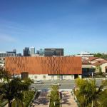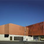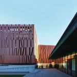 façade of cement board panels shaped and spaced to suggest hundreds of