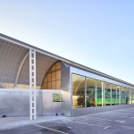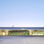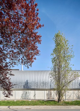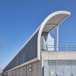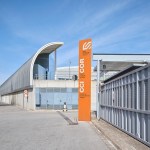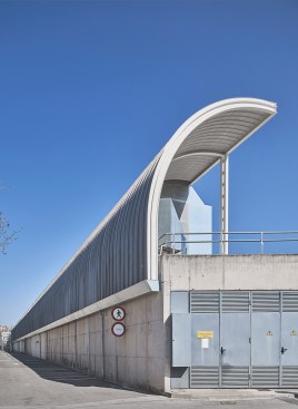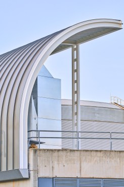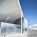 This structure is covered outwardly with continuous smooth sheet metal with a flange joint, avoiding any joint in section and providing a continuous rhythm throughout the new hall’s length. It is only interrupted by the emergency staircase –a deliberately unique volume, free of the main structure– and by the spelling of large corporate letters that subtly present the institution and emphasise the main entrance.