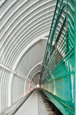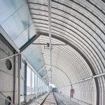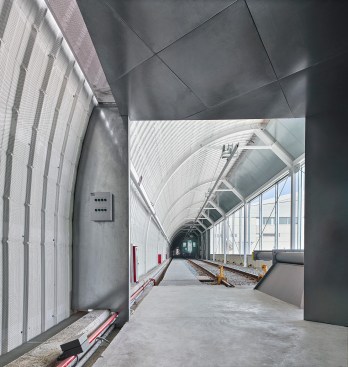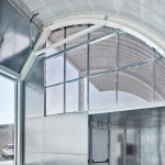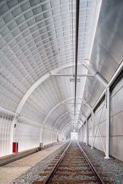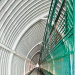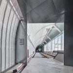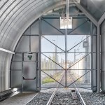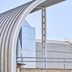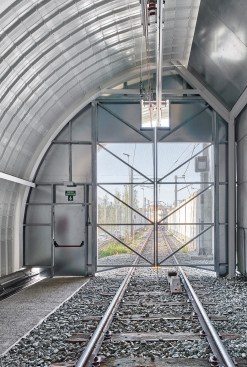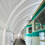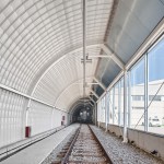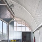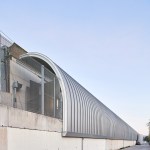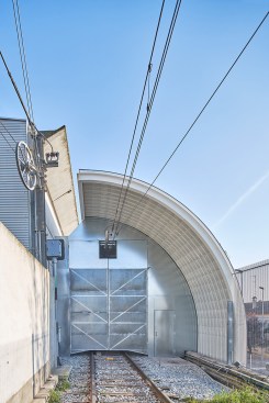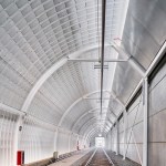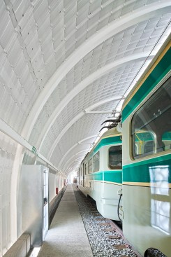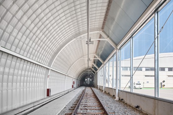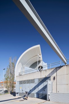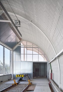 Inside, this structure is presented in a rational and naked manner, thus enhancing its tectonic beauty and marking a constant rhythm that is surprising because of its length. The inner lining of the arched enclosure is also made of sheet metal, although this one is ribbed, dished, microperforated and arranged on large blocks of thermal and acoustic insulation, in order to minimise internal reverberation and noise pollution to the outside, in case of the isolated movement of the historical units.