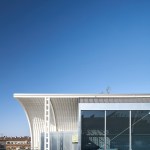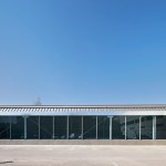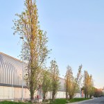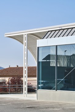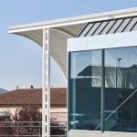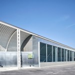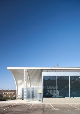 A long arc-shaped continuous section structure of 173.00m is projected, contiguously to the workshop unit, that avoids the problem of distinction between the façade and the roof. The latter, leaning on the existing concrete wall that delimits the perimeter from the Centre and formally separating from the workshop hall, creates an optical transition between the existing curved and sloping roofs and the street, towards which the new image is formed.