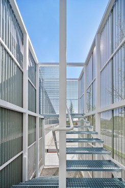 Upon reaching the main entrance to the Centre, the new hall opens onto the offices through a large, from-top-to-bottom glazed façade which allows you to observe the historical units from the outside, as a kind of enormous heritage showcase.