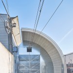 This façade disintegrates into a lower irregular volume when it reaches the end of the industrial unit, highlighting its access by means of a double pillar, also revealing part of the inner face of the arched roof.