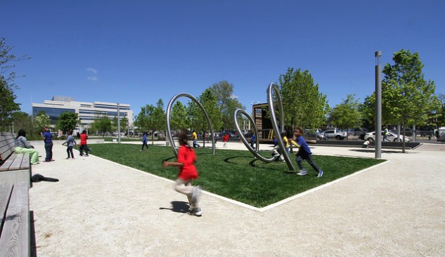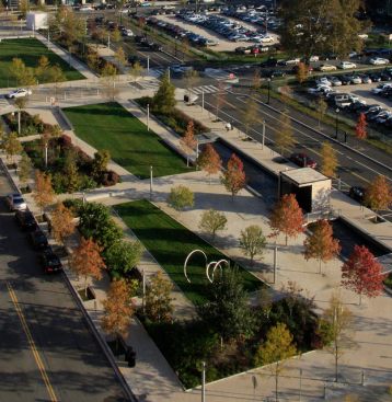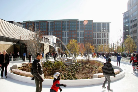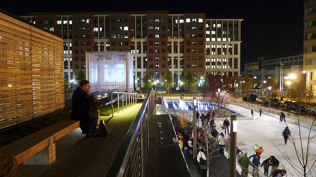 Located on 3 acres of a former parking lot for district school buses, this 3-block-long park is sited along the historic former Washington Canal system. Inspired by the site’s waterfront heritage, the design evokes the history of the space with a linear rain garden and three pavilions reminiscent of floating barges. The rain garden functions as an integrated stormwater system that is estimated to save the city 1.5 million gallons of potable water per year. Stormwater is captured, treated on-site, and re-used for irrigation, building use and interactive fountains. In collaboration with Olin, Studios Architecture designed a pavilion to host a café. A second pavilion serves as a stage and a third offers storage for park amenities. 28 geothermal wells beneath the ice rink provide efficient energy supply for utilities.
