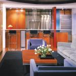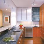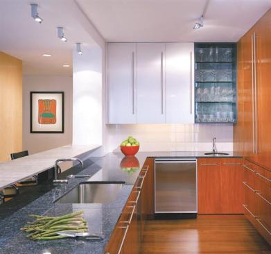 As part of a comprehensive overhaul of the 1,900-square-foot apartment, Gurney rotated the kitchen 90 degrees from its original location. The only elements dividing it from the newly open living and dining area are a floating, aluminum-topped breakfast bar and two structural pillars. “The goal was to make it part of the living space,” Gurney says. So he blended materials in the kitchen to achieve the same rich texture that appears in the rest of the public areas. The subtle striations of the mahogany cabinets contrast with the smooth gleam of stainless steel ones, and a unit of glass shelving adds another element into the mix. A blue granite countertop, dark red and turquoise aniline-dyed wood accents, and a white tile backsplash introduce more colors into the composition. The Brazilian cherry floor in the main room continues into the kitchen to unite the spaces.