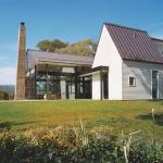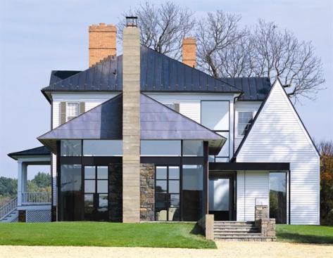 Gurney gave them a three-part addition and renovation that honors the existing house and strengthens its connection to its pastoral site. “It’s agrarian Modernism, straight-up,” said one judge admiringly. A glass-walled pavilion added onto the home’s southwest side provides the casual living and dining area the clients were looking for while bringing in views of rolling hills and grazing horses. A clapboard structure behind it accommodates the mud-room and bath, its standing-seam metal roof and white-painted siding echoing those of the original building. And an entry hall, stairway, and remodeled kitchen act as the transitional spaces between the old house and its new addition. This last portion combines elements of the old house, like the original kitchen windows and a paneled pantry door, with Modernist elements such as large panes of glass and contemporary lighting.
