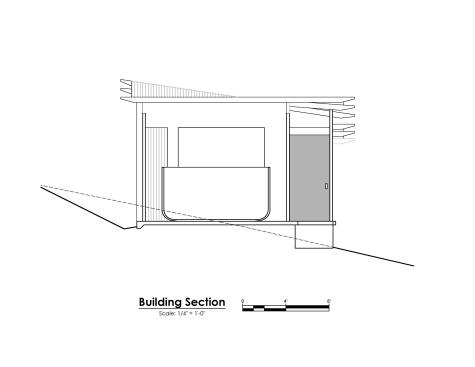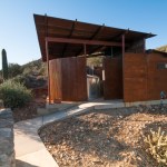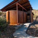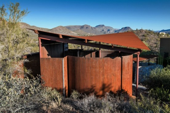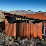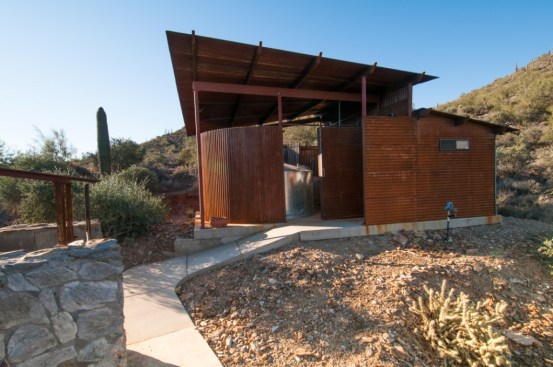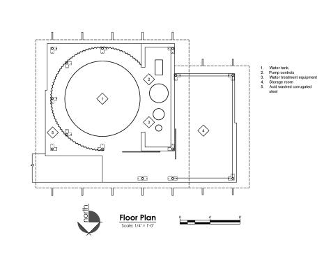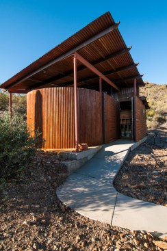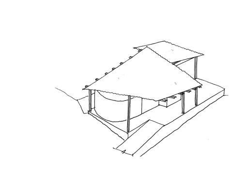 WATER BARN CAVE CREEK, AZ Carved into a slope in rural Cave Creek where livestock barns are the norm sits a small utility building for the purpose of enclosing a large water tank. The water well serving the adjacent residence was no longer capable of maintaining an adequate supply of water as the level of the water table was falling rapidly. We were asked to create a small low-maintenance building which would enclose a 2,500 gallon water tank, pump equipment and water treatment facilities including a storeroom. The concept was to set the building into the slope, design a roof that both resembles wings of Harris hawks, large birds indigenous to the area while encouraging air flow for natural cooling and appeared to have been in place for many years. The result is an acid-washed all steel building of 380 square feet with sliding barn doors, adequate natural ventilation and a soaring roof.