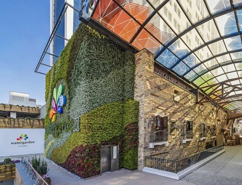 The Water Garden features a ClearSky application with patterned glass that provides a visual element to this shopping mall. The retractable skylights not only warm customers in the winter, but also bring in fresh air and sunlight in the summer months. The retractable structure with colored glass creates a delightful experience for the customers and gives them the freedom of indoor and outdoor depending on the weather.