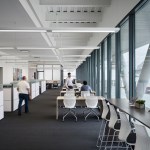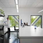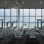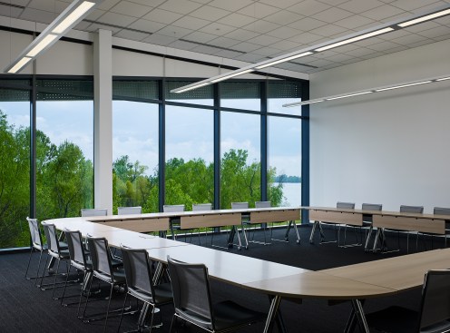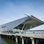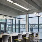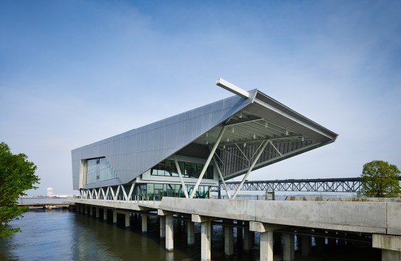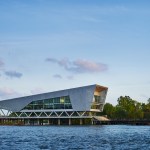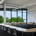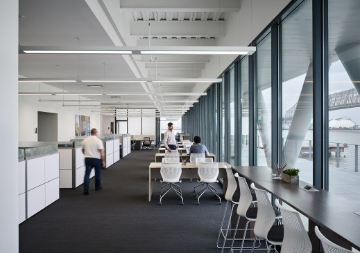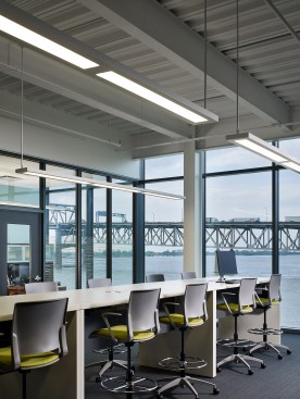 The building’s first floor is fully glazed and recessed behind a series of v-shaped columns to create a setback for a continuous loggia around the building. With large windows along the first floor dock promenade, the wet lab for processing fieldwork investigations is visible to visitors and creates an opportunity to directly engage the public with tours and demonstrations. Open flexible office areas and co-working spaces with views of the river below create cutting edge research, office and collaboration spaces that support the Water Institute’s culture and mission. The second floor houses state-of-the-art office facilities and the third floor features an 8,000-square-foot conference center to host academic conventions, research conferences and private events.