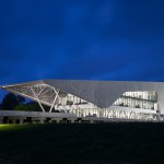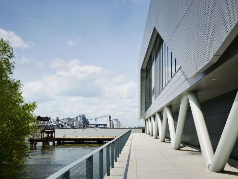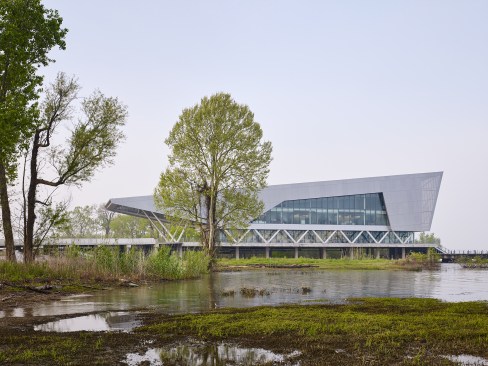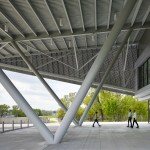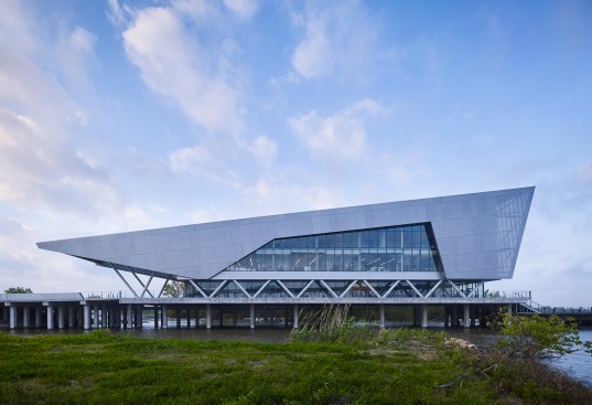 As the Water Institute researches resiliency strategies for mitigating future and environmental impacts to coastal communities, so too does the design of the building. Seasonally, the Mississippi River can rise to shore 40 feet, completely submerging the surrounding shoreline. The building was designed to sit above the maximum anticipated flood line; while the water rises and submerges the surrounding landscape, the building remains accessible and fully functional. Additionally, the design protects the building from intense solar heat gain with a lightweight shroud made of perforated metal scrim.