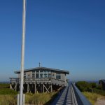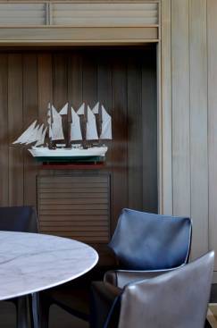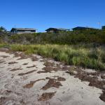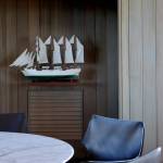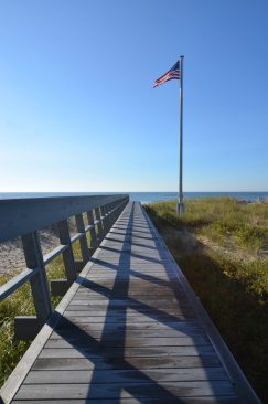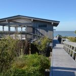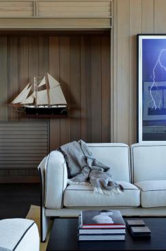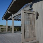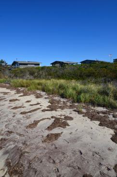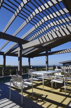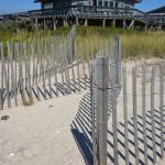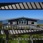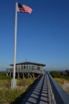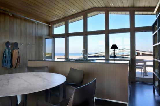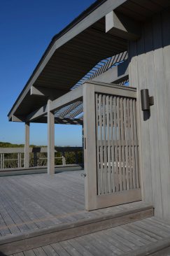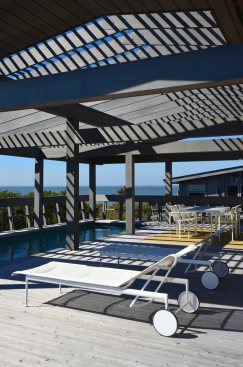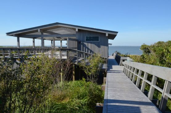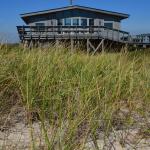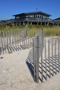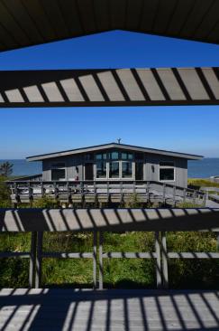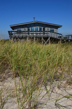 The Fire Island barrier island is a thin strip of sand off the south shore of Long Island, New York. The Great South Bay is to the north of the island, the Atlantic Ocean to the south. Two modest beach bungalows were relocated on the site and rebuilt along a striking boardwalk which floats above the beach brush, connecting the Great South Bay to the Atlantic Ocean. The main house faces the ocean and the guest house faces the bay. A new pool bungalow, inspired by the form of the houses, is perched between them.