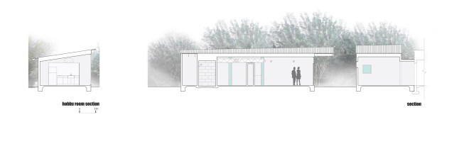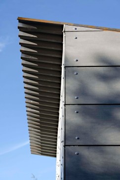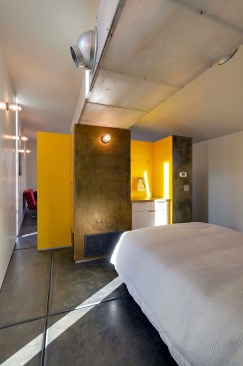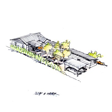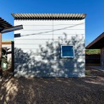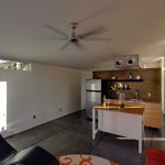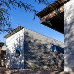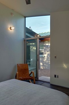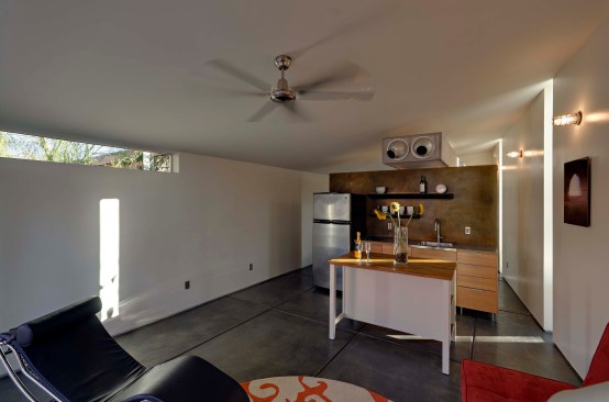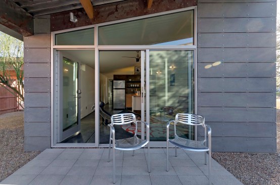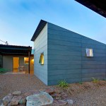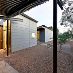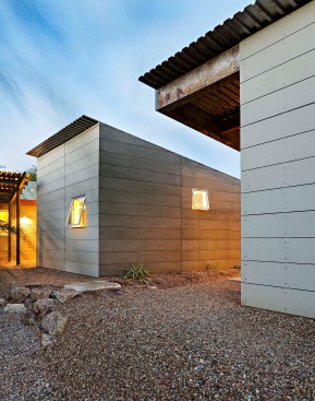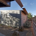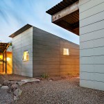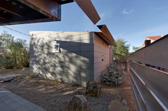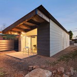 A master suite addition and new guest house are added to a long lot in a neighborhood near a major university to create new infill density in the Sonoran Desert. The design concept re-interprets the existing roof slopes of the existing bungalow onsite to create new space that emphasizes natural light and open interiors. A skewed wall plane is shared by both the master suite addition and the new freestanding guest house to provide continuity and emphasis of the deep lot. Large openings are oriented north while narrow vertical slits slice the east and west walls to create a constantly moving sundial effect throughout the day. Shaded courtyard areas affront the north facing glazing providing welcoming outdoor space for each unit. Energy efficiency is paramount for the small spaces with exo-rigid insulation at walls and roof, high performance soy based expanding insulation in framing cavities and a thick concrete raft slab that floats on rigid insulation to provide a thermal fly-wheel for the interiors. A durable enclosure system was desired by the owners and provided with integral color concrete rainscreen board that wraps the exterior wall attached with precision stainless steel fasteners. Cold rolled corrugated steel on the roof finishes the outside to establish a maintenance free enclosure system for this rental occupancy. The proximity to higher education and the attention to detailing of the project create highly desirable, smart growth housing that taps into existing infrastructure and urban possibilities.