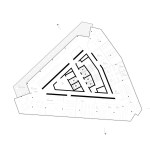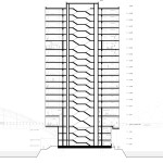 A competition first prize: The Waterfront Hotel is located at a prominent site on the “Molenspitze.” This west-facing triangular point of land sits at the end of an industrial peninsula used for warehouses and container shipping at Frankfurt’s East Bay. The site is further bound by two bridges (the Honsell and the Osthafen) which sequentially cross the Main River along a north-south axis. The site affords panoramic views of the European Central Bank, the new Hafenpark development area, and the prominent Frankfurt skyline. Due to the geometry of the site, the building is organized as a triangular pinwheel with offset corners defined by the depth of the hotel rooms. This strategy breaks down the mass of the 60-meter-tall building, which is further complimented by a folded accordion façade to maximize views and orientations. The façade facing the traffic intersections at the bridge crossing is folded to provide two entrance addresses, one for the hotel and boarding house. The boarding house and hotel are divided by an intermediate 12th level which acts as a meeting place equipped with a bar, fitness, spa and conference space. It is articulated asymmetrically by a column-free open-air loggia facing the west of Frankfurt.