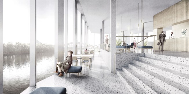 The building is organized in a split-level with entrances to the hotel and boarding house above the “beach club,” which is located at the water. Due to shipping constraints the building cantilevers at the sides facing the water and at its prominent leading ship-like corner. Recalling a historical (yet unbuilt) structure for this site it will resemble a lighthouse: ephemeral and reflective. Due to the cantilevered building volume the facades are curtain walls that are materially and visually light. The cantilever simultaneously provides a roof over the beach club and river walk.