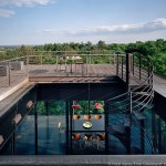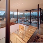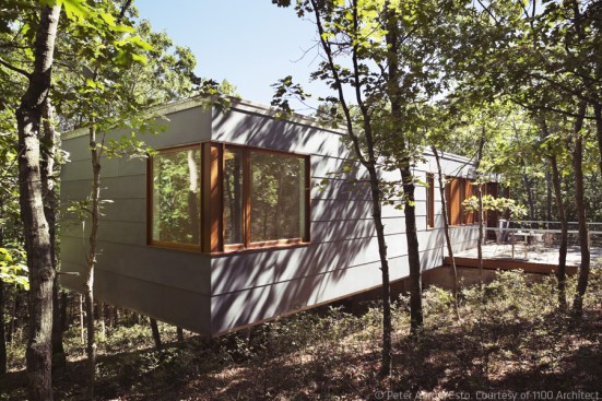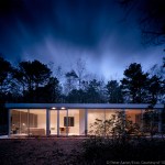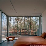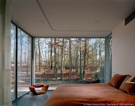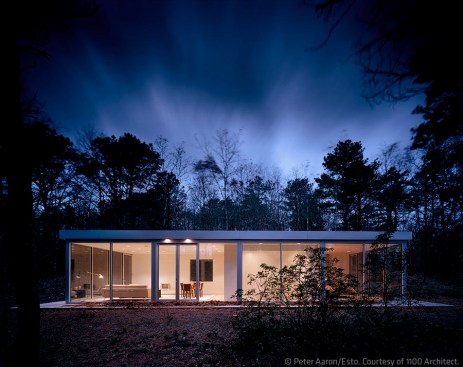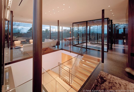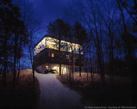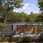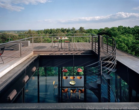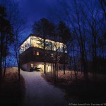 Distributed across fifteen acres of wooded land, this family retreat consists of a main house, guesthouse, pool house, bunk house, and garage. The main house or “glass house” stands on the highest peak of the property, allowing for an unobstructed view of the surrounding landscape and shoreline from the roof terrace. The living spaces on the top floor are enclosed by glass walls that enable light and air to penetrate while a screen of trees provides a sense of privacy. In contrast, the façade of the first floor, which contains the more private spaces of the house, filters light and views through heavyweight fiberglass-screened panels. Set in separate corners of the property, the glass-walled guesthouse and pool house echo the main house’s underlying principle: open to light, hidden by trees. The bunk house, a multi-use space that is the latest addition to the complex, is conceived of as a forested retreat.