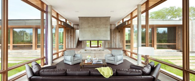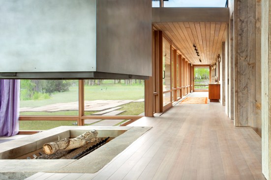 The 3,600 square foot structure sits on a 30” tall porous plinth raising the finish floors well above the flood line, allowing rising waters to pass around and under the foundation. A covered walkway on the western side of the property adds to width of the wood-clad structure to evoke the scale and language of a frontier town. Within the open plan, a hanging orb fireplace anchors the two wings and provides a focal point, for the entry on one side, and the living/dining area on the other.