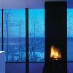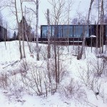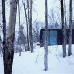 Julie Snow Architects • On the north shoreline of Lake Superior, Weekend House is a quiet retreat for its owners. The owners—the architect and her husband—studied the site for years before deciding to build and their respectful relationship with the lake helped them imagine a home that would tread lightly on the pristine four-acre site, populated by spruce and birch trees along 240 feet of shoreline. The architect responded with a “stealthy” design, placing the 1,300-square-foot, one-story dwelling 40 feet back from the shore. Two black-framed glass structures contain the main house and a small studio, which are separated by an open deck. A single heat-circulating fireplace emerges from the living room.