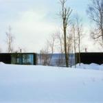 The jurors were nearly unanimous in their praise of the aesthetics of “the chill house,” as they called it. They all thought it beautiful, and that “[the details] are so refined,” as juror John Cary said. It’s evident that the architects focused on material selection. The exterior panels are made of back-ventilated pre-drilled Skatelite, a material typically used for skateboard ramps, that was chosen for its color and durability. Narrow argon-filled aluminum windows are supported on a steel ledge, allowing the sill and head to extend below the floor and above the ceiling, to enhance an uninterrupted connection to the exterior. The glazing details and the siting combine to make views of the lake and surrounding landscape an immediate panoramic experience. The black post-and-beam boxes rest lightly in the winter landscape of black and white tree trunks, while in the summer, they fade into the green foliage.
