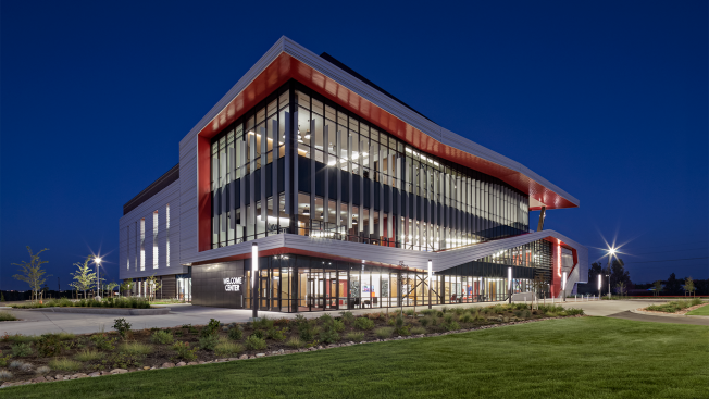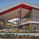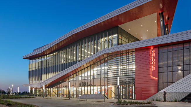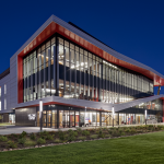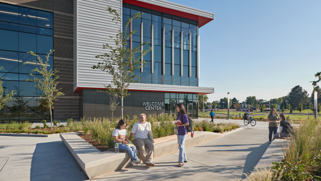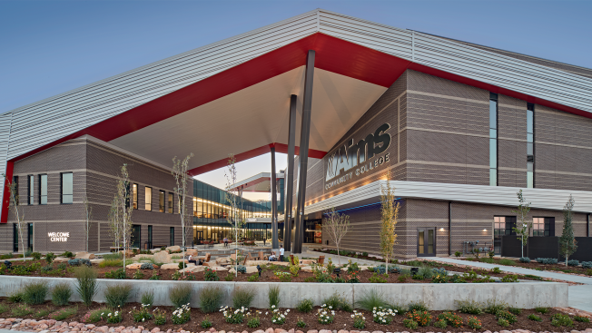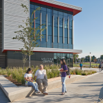 The Welcome Center serves as the new front door and arrival point to to Aims’ Greeley campus. The Welcome Center includes admissions services, enrollment, records, testing, financial aid, cashier, advising, and the transitions center. The building also includes a auditorium and ballroom that serve as a graduation venue and gathering place that’s available to both Aims and the Northern Colorado community. The ballroom, which accommodates 800 people, is on the third floor to take advantage of Western views toward the Front Range, and includes a rooftop patio. The auditorium is flexible in its scale, and can flex from 500 occupants to 1700 by closing off seating tiers and converting flat floor meeting rooms to open balconies with collapsing tiered seating and operable partitions.