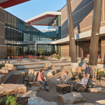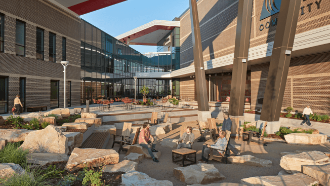 Additionally, the building includes a partially-covered courtyard area for outdoor activities which protects occupants from overexposure to sun and wind. This unique interior courtyard features a two-way stage which allows the auditorium stage to flex from the interior to the exterior.