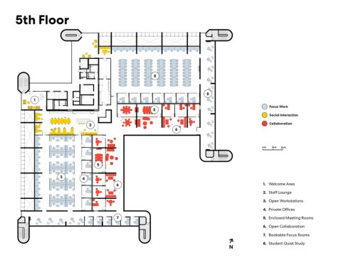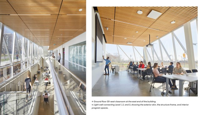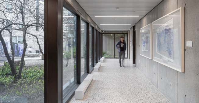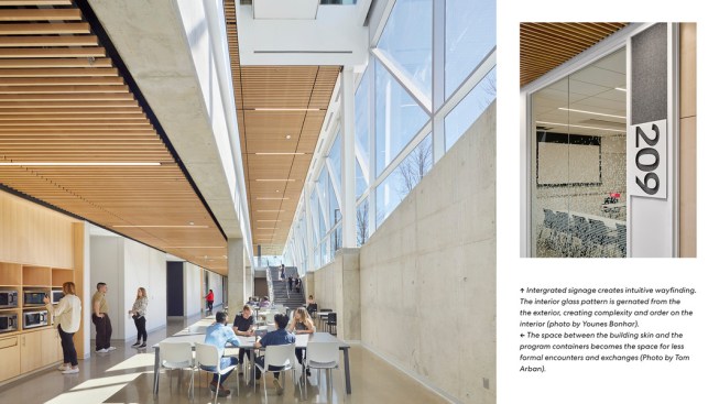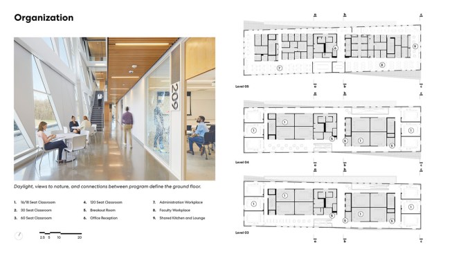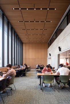 On each level, the architects pushed both student and staff areas, including gathering and meeting spaces, toward the windows and skylights, to maximize daylight and views to outside. Even cellular spaces, which were pulled inward, benefit from light trickling in through glazed partitions. A less conspicuous but necessary update is expanded power and data access for laptop, mobile phone, and tablet computer use. Finally, upgraded mechanical systems enhance air quality throughout while reducing energy use by 30 percent. Together, these moves increase occupant comfort and, by extension, foster wellbeing.
