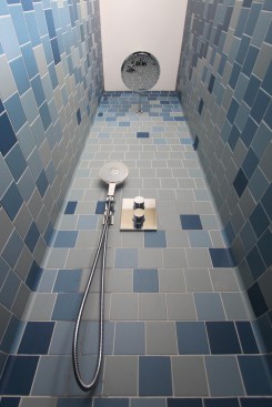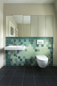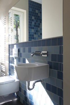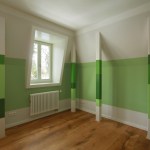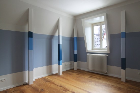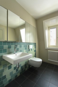 To fulfill the clients wishes suitably a number of interventions had to take place. All light partitions were removed to create large contiguous spaces on the ground floor. The entrance area was enlarged distinctly and functions now as distributer from which the main living area and kitchen, guest room and bathroom, cellar, chamber and the top floor can be reached directly. The staircase was opened to the top floor by a large well hole. There an open and flexibly usable space follows before, across the short corridor, there are children´s and bedrooms as well as the family bathroom. A further bathroom for guests was added on the ground floor. The color spectrum in the bathrooms was conceptualized as contrast to the remaining neutrally designed rooms.