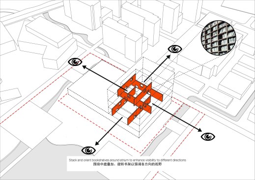 Located at the ground and first level, the student activity centre is designed as a central marketplace. Accessible from all sides, the activity centre will provide spaces for a cafe, theatre, dance and music studios, exhibition space, sports and games, and spaces for informal meeting and gathering. Stairs and bridges in the atrium connects the upper levels, where a grand “book stack” in the light-filled atrium leads up to the library and study spaces on the third to ninth floor.