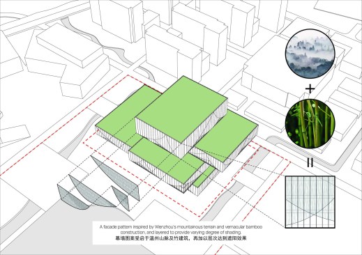 The winning proposal of the new Student Centre & Library by Schmidt Hammer Lassen is designed to embrace diversity, interaction and knowledge sharing. The new building connects the educational faculties in the south and student residence in the north. Set against a beautiful backdrop of mountains, the exterior of the Student Centre & Library appears as four rectangular shapes placed on top of one another. The building is wrapped in semi-transparent glass covered in an abstract fritted pattern. The facade is inspired by Wenzhou’s mountainous terrain, and vernacular bamboo construction common in the city’s historical architecture.