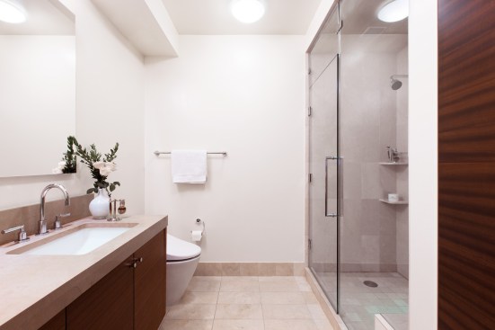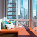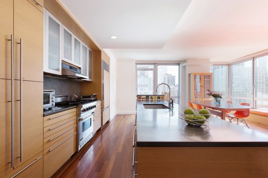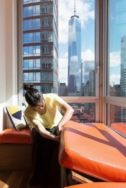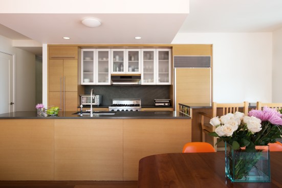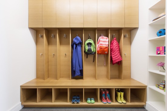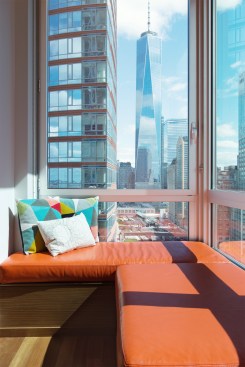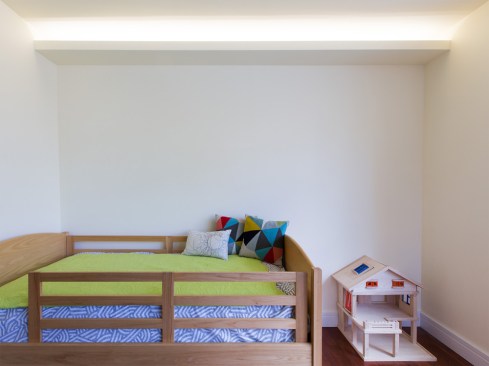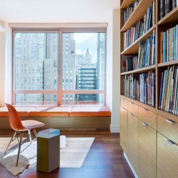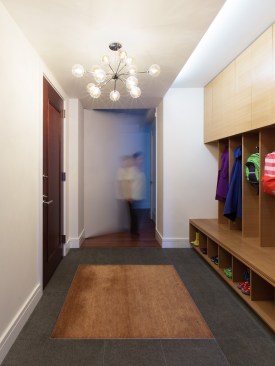 Perched on the 21st floor of a high-rise building in Manhattan with panoramic views of the Hudson River, this renovation combines two adjacent units for a multi-generational family. A strategic reconfiguration of the floor plan eliminated the redundancies of two living rooms, two kitchens, two master bathrooms, etc., while unifying the entire space under a cohesive, clean modern design. Custom cabinetry was provided throughout the apartment, providing much needed storage. Urban living requires optimum and efficient use of space – we took advantage of the odd nook and crannies and filled in with small benches along the window wall allowing to taken in the view while providing storage below. The developer built building left the lighting dim and sterile, so we provided soft up lighting throughout, reducing the glare of the expansive glazing. We designed a custom oak wood mudroom which we called "the pivot" in the apartment; a central space that organized the apartment with bedrooms located off to one side of the newly combined apartment, and the more social gathering spaces including the kitchen and dining area to the other. It also provided much needed individual cubbies for each child, perfectly suited for dropping off/storing their belongings.