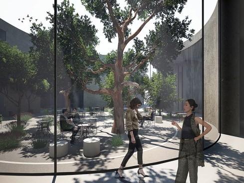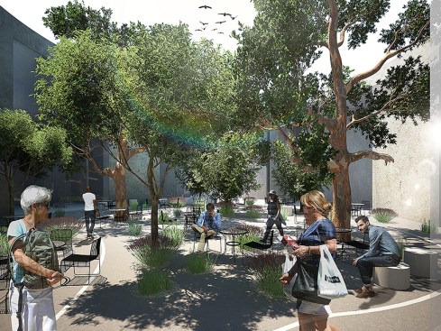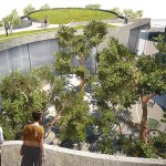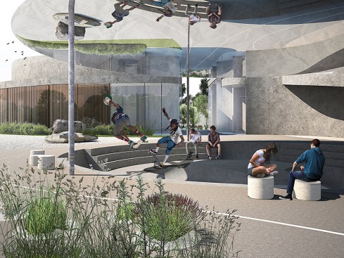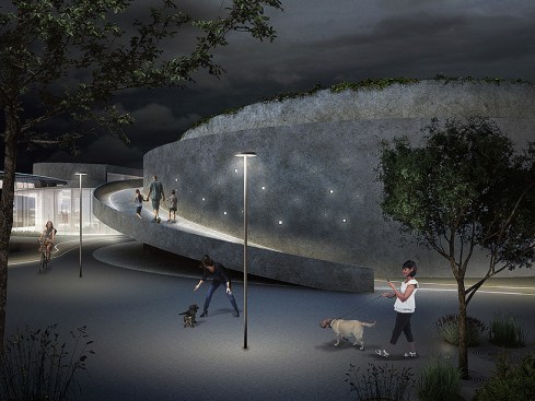 Title: West Attica Headquarters, Eleusis, GR Year: 2018 Credits: Practice: LandmArch. Landscape Architecture Members: Senior Architect & Landscape Architect: Xenia Mastoraki Architect & Landscape Architect: Anna Ioannidou Architect: Eirini Triantafyllou Landscape Architect: Alexandros Datsos 3D design: Christos Pampafikos Architecture Lighting Designer: Sophia Poulopoulou Mechanical Engineer Phd: Dr. Ioannis Pappas The aim of the proposal is the design of a contemporary, functional and bio climatic public building which accommodates the Region of West Attica Headquarters, in Elefsina. The new complex upgrades the urban landscape of the area while reflecting its multi-dimensional history. The circular structure of the building corresponds to the gradual transition from more public areas to more private ones, as we move from the perimeter towards the center of the circle. The lack of open, green spaces in the surrounding area, dictates the need to introduce a new, high – quality open public space which will be accessible to all the residents. The project aims to achieve the highest possible autonomy in terms of energy consumption. With the addition of the green roof, Building – Integrated Photovoltaics (BIPV) on the south facade of the building and various other techniques the bio climatic performance of the building is secured. The use of semi – transparent materials between the working spaces provides abundant light and sufficient ventilation for the interior spaces. The use of materials and construction methods which are applied correspond to the need for high energy – efficiency and low maintenance. The choice of concrete as the main building material, reflects the industrial character of the region’s urban landscape. The building, while being located on an important urban node, within a network of other significant public spaces in the city of Elefsina, becomes its new landmark. The site is accessible from all sides and the outdoor spaces are used exclusively from pedestrians. The working spaces on the ground floor communicate directly with the existing round forest in the heart of the building complex. This forest is connected to the rest of the landscape and to the circular skate plaza which marks the entrance to the site, through an open wide corridor. The ramp element connects the green roof of the building to the rest of the landscape. On the green roof, there are footpaths and several points of observation which offer panoramic views of the surrounding area to the visitors. The existing vegetation is preserved as much as possible, mainly in the circular forest and in the perimeter of the site. The main construction materials are concrete, glass and metal. The structure of the building consists of cylindrical concrete walls, which adopt the vocabulary of Elefsina’s industrial landscape. The various departments are divided through opaque panels, while the individual offices are divided through transparent panels of characteristic color, according to the department they belong to. The building is equipped with a double facade, whose exterior layer consists either from concrete (north orientation) or from glass with Building – Integrated Photovoltaics (BIPV) towards the south. Parts of this double facade are protected from the sun by rotating vertical elements, depending on the orientation and the season or time of the day.