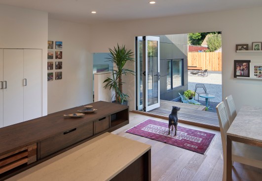 The existing bungalow, in poor repair after years of neglected dry rot, was renovated with new stucco and windows. The existing trim was removed, creating a short, boxy counterpart to the new addition tower. Built in 1926 and minimally renovated in the 1960s, the existing bungalow had a rickety sliding door that thwarted access to the neglected backyard. This was replaced with a wider accordion door and small deck, creating a generous relationship between the house and the exterior