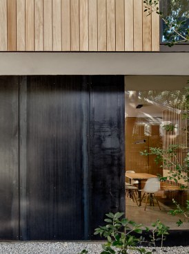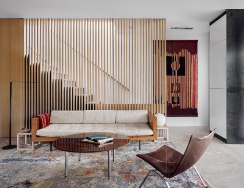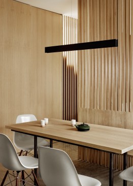 Particularly lovely moments occur where a slatted oak screen reveals a staircase—as if it were an anticipated guest—and where a warm wood panel faces off against a lacquered steel one.