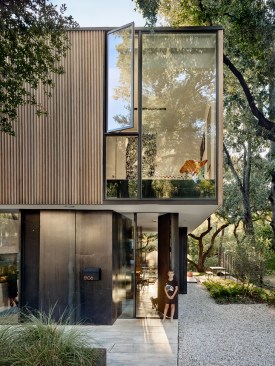 Constrained by mature oaks and property setbacks, the net-zero West Campus Residence squeezes into one of the densest neighborhoods of Austin, Texas. Designed by Alterstudio and Mell Lawrence Architects for one of Alterstudio’s architects and their five-member family, the two-story, 1,922-square-foot residence delivers an efficient and cost-effective space that is in harmony with its surroundings. The interior invites in the outdoors through extensive first-floor glazing, skylights, and a second-floor porch that engages with the street.