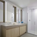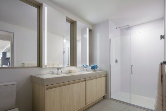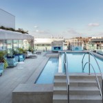 Youthful, airy, and energetic, the interiors at West Half Street are pockets of excitement themselves, defined by gently angled elements, minimalistic details, and a few tectonic finishes. The building’s indoor-outdoor connection is bolstered by interior elements such as the large indoor gym, which is exposed to the elements through an adjacent inner courtyard, as well as the landscaped rooftop pool and resident lounge.
