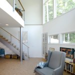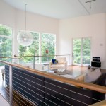 The staircase, with its open risers and reclaimed wood timber treads, is a favorite of the owners. The stainless steel cable railing winds its way up the stairs, along the edge of the atrium and connects visually to a cable rail outside along adjacent exterior balcony. The stair act as a beautiful physical connector between the levels.