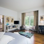I designed the guest house with an atrium in mind, connecting the upper and lower levels, allowing light into both floors while at the same time, keeping them separate. The inspiration for the upper level of this 2,600 sf house was of a tree house. It’s open and casual, with a high ceiling and large windows, making one feel like they are both indoors and out. It’s modern, but decidedly warm. The lower level is a cozy space housing a home office and TV viewing area, which can also be used as a dance studio for one of the owners.