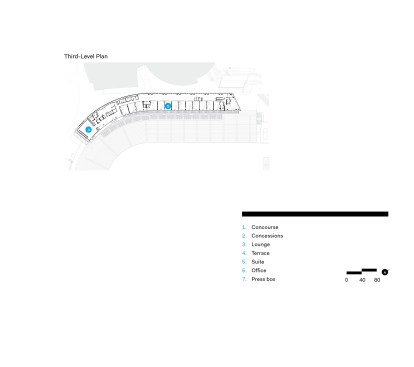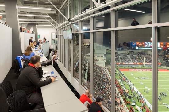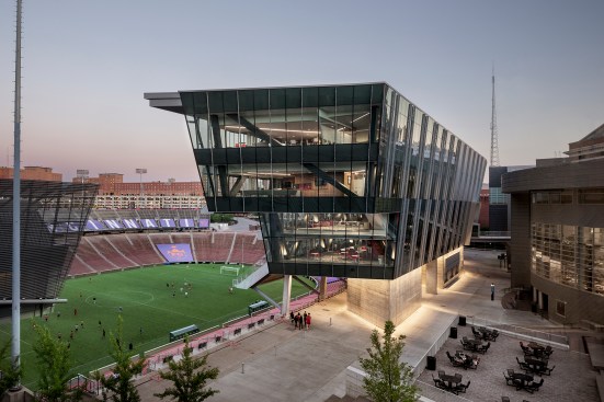 ARO lifted the addition off the ground, preserving space for north-south foot traffic and opening up ground-level views into the stadium. Supporting it are three cast-in-place concrete structures, which house concessions, elevator banks, and mechanical rooms. This also facilitates access to the field, realizing another goal for the university: The stadium is now as much a central commons as it is home to its football team. In fact, since it opened last fall, the addition has been used for more than 150 non-football events.