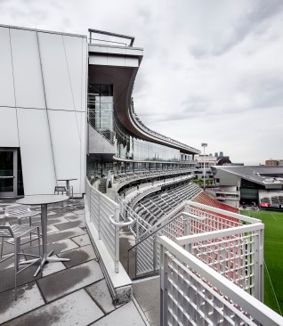 But ARO—founded in 1993 by Stephen Cassell, AIA, and Adam Yarinsky, FAIA (a third principal, Kim Yao, AIA, joined later)—turned out to be an inspired choice for a surprisingly tricky brief: part of an $86 million renovation to the 114-year-old Nippert Stadium, one of the country’s oldest collegiate sports facilities. The 450-foot-long, 115,000-square-foot addition on the western side of the stadium had to cram luxury boxes, press facilities, lounges, and concession space into a narrow triangle between existing seating and the Tangeman University Center, designed by Gwathmey Siegel Kaufman Architects (Mayne’s Campus Recreational Center is just south of the new building).