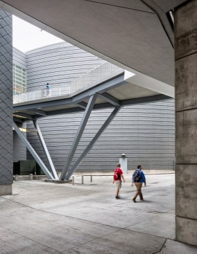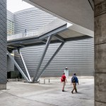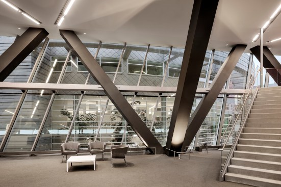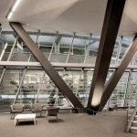 The West Pavilion’s elegant, expressive identity is derived from an x-braced steel structural frame that is visually striking.  It is also highly practical, with self-bracing diagonals that resist lateral forces and use less steel than a conventional frame. The internal super diagonal frames provide lateral bracing for the upper portions of the building.