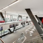 ARO and Heery developed an innovative and visually striking X-braced structural truss that serves as the building’s basic frame. The system’s self-bracing efficiency saved 50 tons of steel, according to ARO, while enabling dramatic double-height spaces across the interior. A footbridge connects the addition to the Tangeman Center.