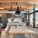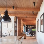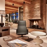To lend coherence throughout the apartment, flooring, ceilings, and lighting were made consistent throughout; flooring is twelve-inch-wide Douglas fir planks, while the ceiling is made with six-inch-wide, clear, tongue-and-groove cedar. Existing, structural wood beams were sanded to expose the wood’s natural color. Lighting is integrated into the ceiling plane, helping to create a tidy ceiling while adding a dramatic visual element that was previously lacking. The sandstone fireplace and built-in terrace grill, were converted from wood to gas for ease of use, and for environmental considerations. Energy-efficient Runtal radiant heaters replace the previously inefficient heating system.
