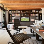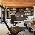 The kitchen employs a minimal, albeit materially rich, aesthetic and features dark cabinets and a bold, contrasting travertine island. A sliding wood dining table partially nests underneath the island and can pulled out to seat additional guests for dinner. A portion of the kitchen was pushed back to accommodate a small, butler’s pantry. In the living area, the custom-designed, built-in TV cabinet and book shelves are made from rift cut, dark-stained, white oak. When not in use, the TV can be concealed with sliding, pitted-steel panels. The interiors blend vintage, custom-designed (the coffee table, end tables and dining table were designed by the architects), and contemporary furnishings. Strong textures and forms provide a counterpoint to the simple, neutral bones of the space.