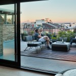 To start, the designers at SkB Architects combined the previously separated kitchen, living, and dining areas to create a central, flowing space for the family. The resulting contiguous, shared living area serves as a counterpoint to the otherwise modest living quarters. Access to the south-facing terrace was enhanced through the addition of large, glass sliders that visually and physically merge indoor space with the outdoors—effectively doubling the living space on nice days and affording views to Elliott Bay and Mt. Rainier. An ipe “area rug” defines a cozy, terrace sitting area not far from the double-sided sandstone fireplace. The sliders feature UV-coated glazing to control heat gain.