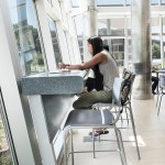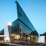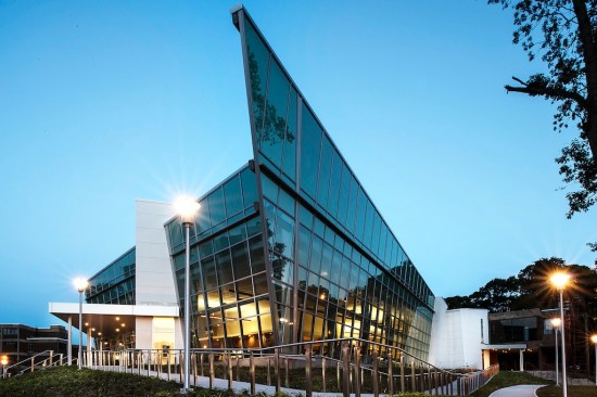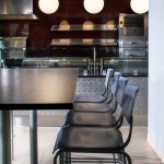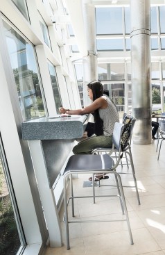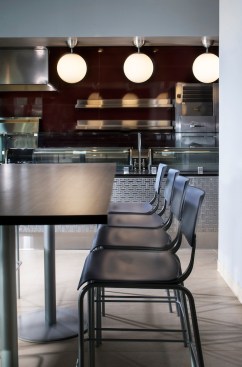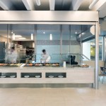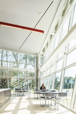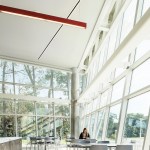 Our client’s goal for this 400-seat dining hall addition and renovation at Stony Brook University was to expand and transform a dated, traditional, daytime service quad dining hall. The result is a dynamic 24/7, campus-wide dining facility serving the university’s diverse campus population including commuter students, undergraduate housing communities and on-campus apartment dwellers. Our design accomplishment included developing a modern glass “shard” building envelope juxtaposed against the brutalist character of the original dining hall, creating an iconic architectural element for West Campus. Dramatic views of the surrounding forest from within the new addition serve to amplify the building’s connection to the environment and the pedestrian culture of the campus. Featuring a striking red light fixture set within the double-volume ceiling, West Side Dining now acts as a beacon in the evening set against a wooded campus backdrop. The addition features multiple retail-style dining platforms with high-impact but low-maintenance materials such as perforated steel columns, stainless steel counters, quartz tops and ceramic tile flooring. Digital media presents the diverse menu choices ranging from “Eastern Cuisine” to “Bob’s BBQ.” Environmentally conscious innovations contributed to the project achieving LEED Silver certification, including a white bitumen asphalt roof, fritted glass and low-e coating on the curtain wall to decrease sun exposure, waterless urinals and an automated vent hood system throughout the kitchen.