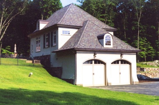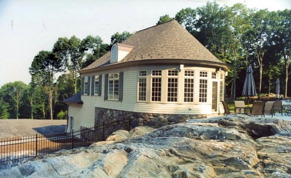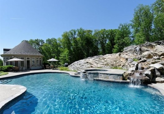 The pool house has a kitchen, bath, and changing rooms above a two car garage. The free form pool that sits adjacent to the pool house was blasted out of the rock ledge and incorporates a waterfall down the face of the rock into the pool.