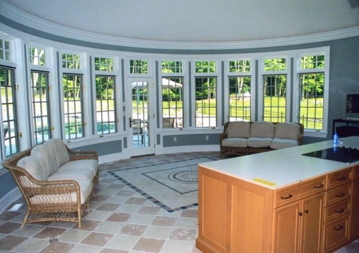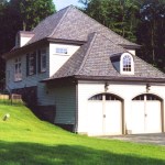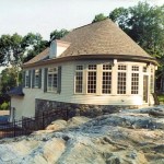 The architectural design includes an extensive use of round forms in plan & elevation that create both great spaces inside & interesting forms outside. Exterior materials: cedar shingle siding, fiberglass shingle roofing (with the appearance of slate), copper gutters & leaders, & board & batten shutters.