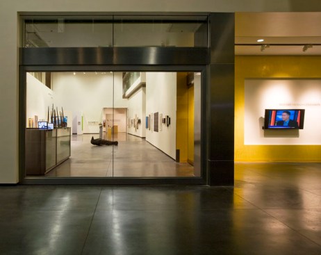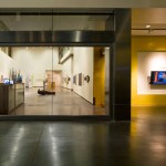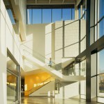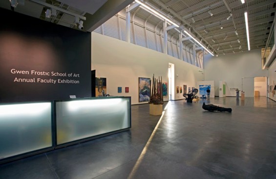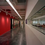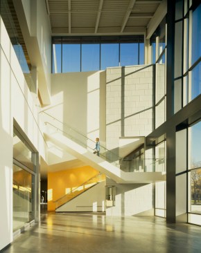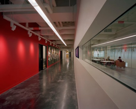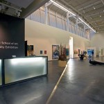 The design intent was to have layered views throughout the building. Clad with windows in the front, passerby would be drawn into the building with art in plain view. Likewise, within the building the ceilings span 40 ft. high and multiple levels are overlapping the lobby offering a transparent view from many angles throughout the multi-level facility. In the lobby, tall white walls are set in place for the students to display video art. The art is meant to be seen from both the sidewalks outside and multiple levels inside.