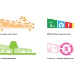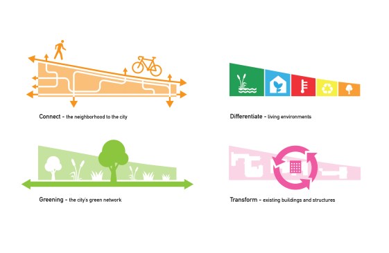 The 70,000-square-meter masterplan by MVRDV continues the landscapes of the Westerpark, dividing the elongated area between the Haarlemmervaart and the Brettenpad into five sections of between 90 and 250 dwellings each. This plot structure aligns with the street pattern of the area to the south of the plan, and allows for many green areas, which are favourable for water retention. The landscape of Westerpark-West is designed by the London-based Gustafson Porter + Bowman, who in 2003 designed the park around the Westergasfabriek, extending the landscape of the Westerpark to its current boundaries.