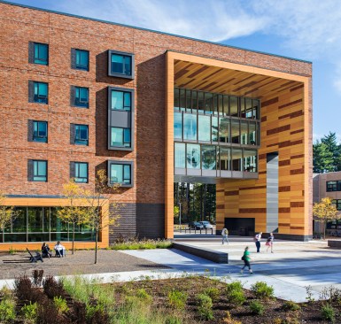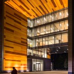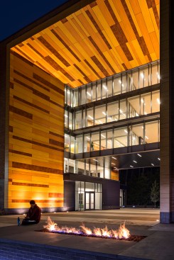 The woods and mountains surrounding University Hall inspired the architecture and interior design of the new building. Designed around the concept of a student’s journey of ‘walking through the woods toward the light’ ADD Inc created a building shaped like “two trees fallen in the forest” with a large arch that leads from a wooded overlook of the Tekoa mountains back to the campus quad.