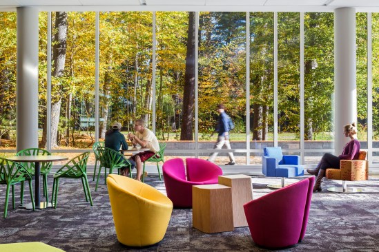 The wall colors used throughout the Ely Campus Center were chosen to convey airiness and augment newly light-filled rooms, and furnishings were selected in deep oranges, greens and blues to communicate vitality.